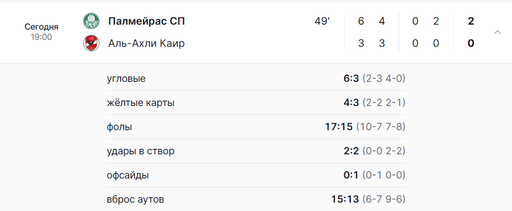 Второй — с портала Flashscore. Можете открыть Sofascore или любой другой лайвскор — цифры будут ровно те же: