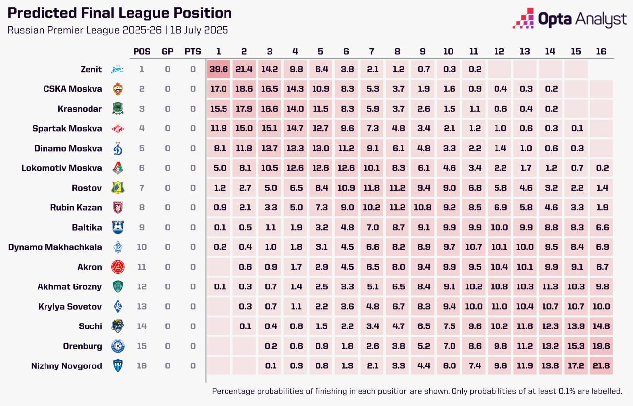 Ну какой старт сезона без предикта от аналитической машины, который формируется по итогам 10 тысяч симуляций? Никто и не сомневался, что фаворитом будет «Зенит». Но шансы гораздо ниже, чем перед РПЛ-2024/25 — тогда Opta давала 49,9%. Титул «Краснодара» компьютер оценивал всего в 9,2%.