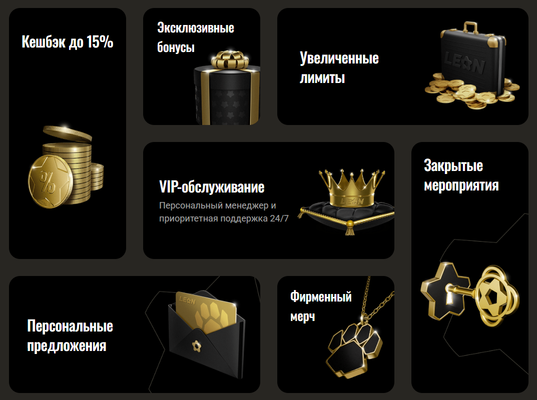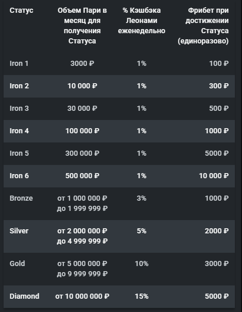 В Leon Family есть пять статусов: Iron, Bronze, Silver, Gold и Diamond, Iron разделён ещё на шесть более мелких уровней. Суть в целом не нова: новый статус достигается за счёт определённой суммы ставок за месяц — на каждом статусе свой процент кешбэка + единоразовый фрибет. Но есть один важный нюанс, который и отличает Leon Family от очень похожей по принципу VIP-ПЛ в «Лиге Ставок»: кешбэк здесь начисляется не живыми деньгами, а как раз леонами, которые можно обменивать на фрибеты в леоншопе (или на эксклюзивный мерч, когда он там появится — пока доступны только фрибеты).