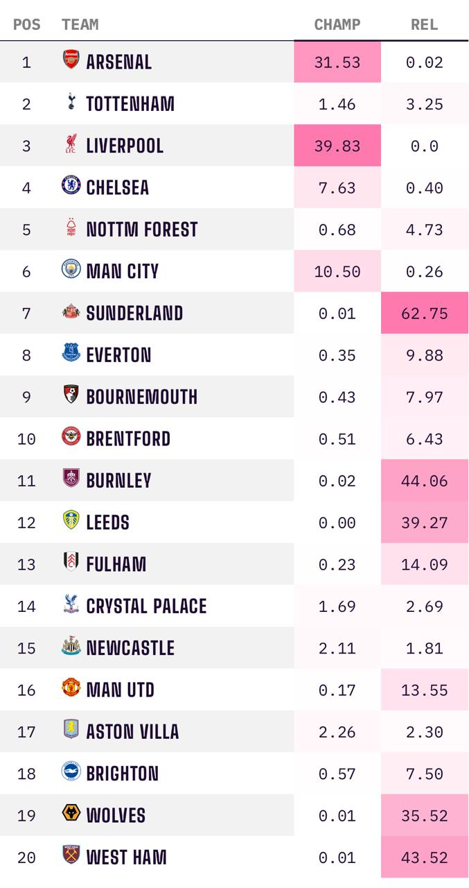 В свежем предикте суперкомпьютера, куда не забыли заложить поражение от «Гримсби Таун» в 1/32 финала Кубка лиги, вероятность титула «Манчестер Юнайтед» составляет 0,17%: это меньше, чем шансы на чемпионство «Фулхэма» и «Борнмута». При этом вероятность вылета больше почти в 80 раз — 13,55%: лишь шесть команд АПЛ имеют ещё более реальные перспективы отправиться в Чемпионшип.