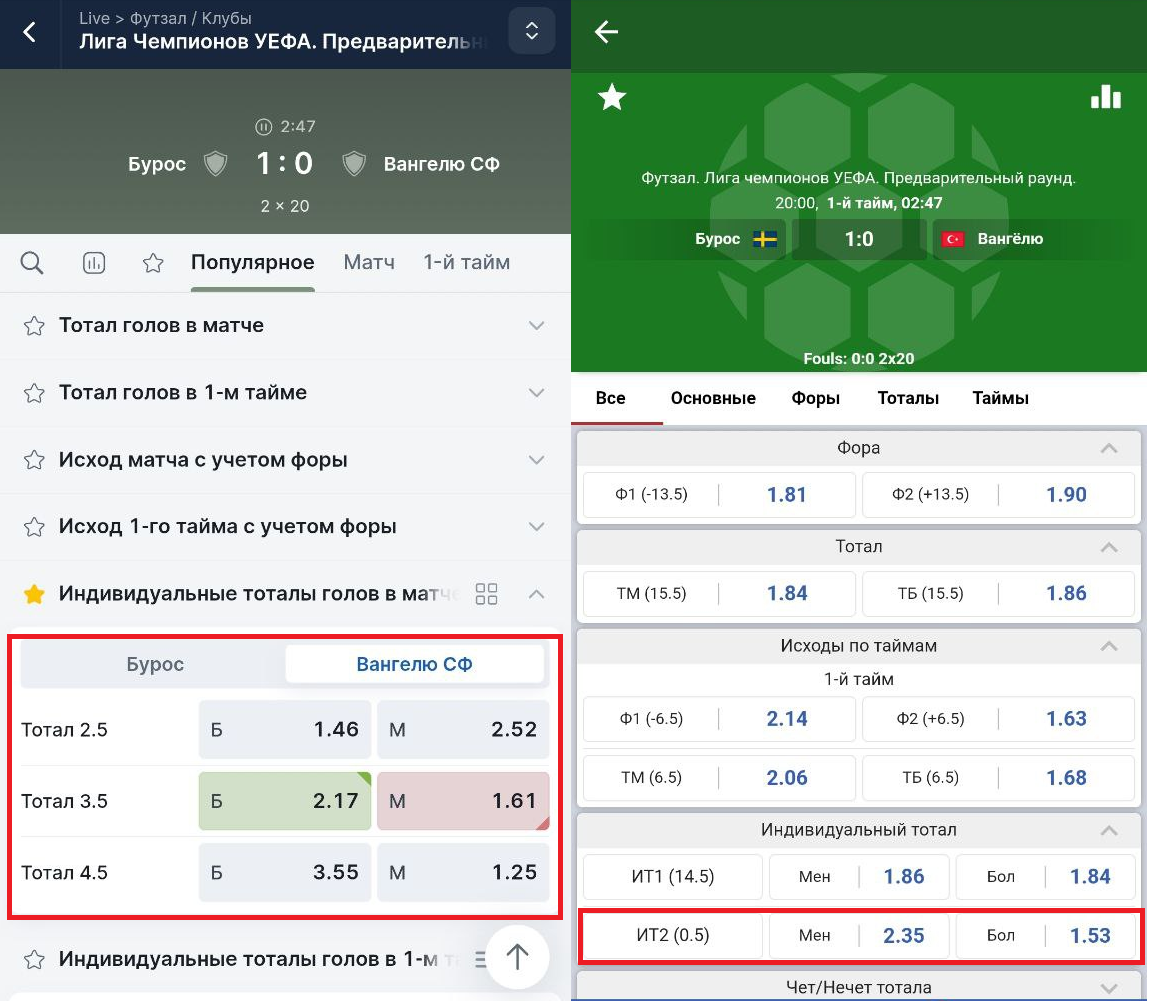 Букмекеры внезапно не смогли разобраться, сколько же всё-таки голов должен забить турецкий «Вангёлю» в ворота шведского «Буроса» в предварительном раунде футзальной ЛЧ — этот факт и подметил в своём телеграм-канале эксперт Legalbet Павел Боровко. Не разобрались прям сильно: на третьей минуте встречи Fonbet давал в основной линии на индивидуальный тотал «Вангёлю» 3,5 мяча с возможностью также поставить на 2,5 и 4,5. А в тот же самый момент БЕТСИТИ даже в одном голе от гостей сомневался — ИТБ 0,5 турок шёл за 1.53.