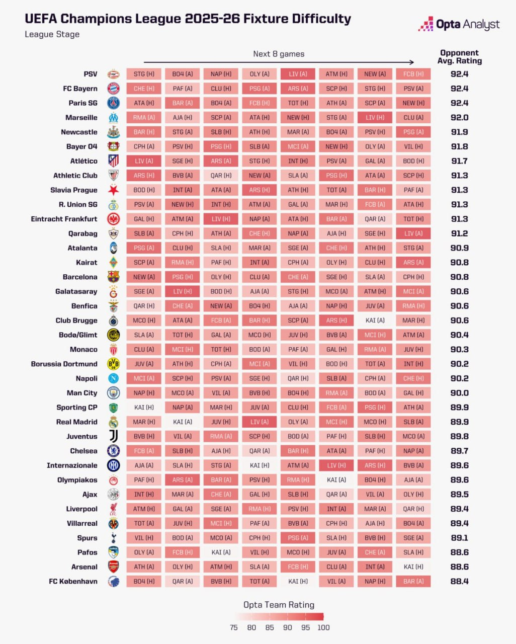 Причём сразу у трёх клубов: «Арсенал», «Тоттенхэм» и «Ливерпуль» попали в топ-6 участников с лучшим расписанием Общего этапа. Самый сок у «Копенгагена», но его не назвать командой, которая сможет воспользоваться таким неосязаемым преимуществом. Да и рейтинг всё равно сравнительный, играть датчанам придётся с «Байером», тем же «Тоттенхэмом», «Наполи» и «Барселоной».