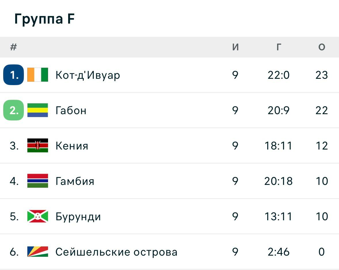 И даже так ивуарийцы вообще не обязательно займут первое место в группе и выйдут на ЧМ-2026 напрямую — у них 23 очка, у второго Габона 22. Он закрывает отборочный цикл дома с Бурунди, последней командой группы, если не считать бедолаг с Сейшельских островов.