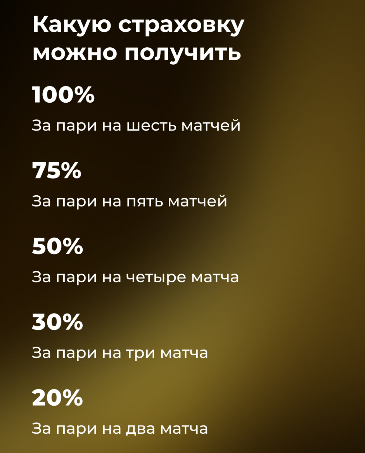 В акции участвуют только пари на финал и итоги турнира, но знать о ней нужно уже сегодня. Чтобы получить максимальные 100%, нужно было зарядить на все шесть матчей. Первые два прошли вчера, осталось четыре — за них БК даст 50% от проигранной ставки. То есть если вы подключитесь только в финальный день, больше 20% кешбэка не видать. Разница существенная.