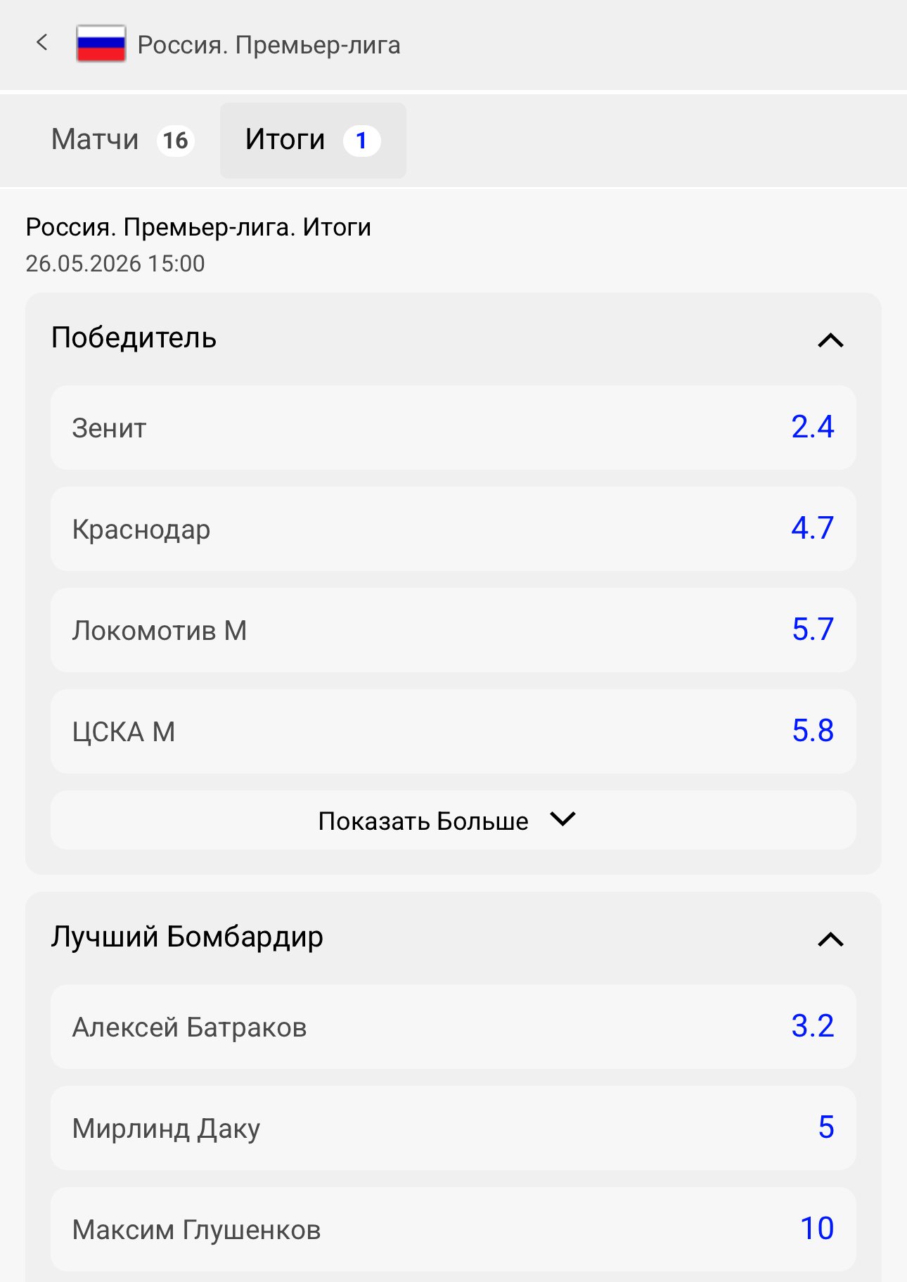 На топовые турниры букмекер предлагает долгосрочные маркеты — можно поставить на победителя, вылет, лучшего бомбардира или тот же топ-4. На примере РПЛ — в доступе только чемпион и «Золотая бутса»: