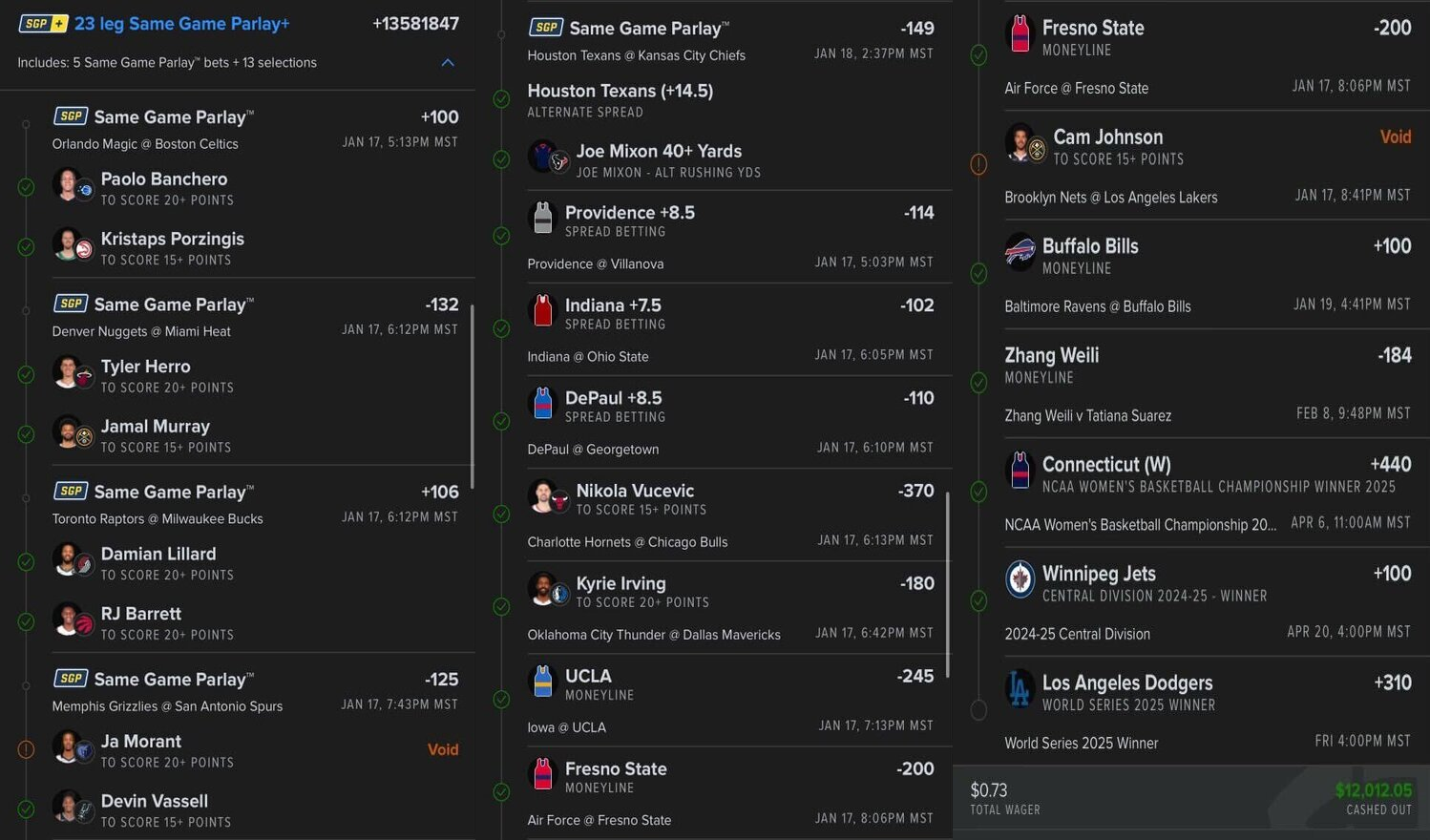 Автор одного из легендарнейших купонов в истории американского беттинга не выдержал и всё-таки продал свой чудо-пресс, который он собрал аж 17 января. В его купон попали 23 события из самых разных видов спорта и чемпионатов: ИТБ игроков в НБА, форы в баскетбольной NCAA, исходы в НФЛ, бой в UFC и ещё несколько долгосроков. Общий кэф просто дикий — 135819.47, а улетели на него скромнейшие 73 цента, примерно 60 рублей по нынешнему курсу.