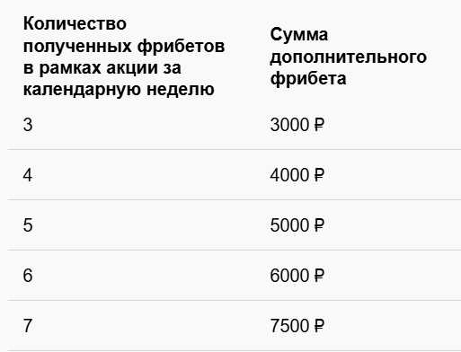 Бонус: по итогам каждой календарной недели можно получить дополнительное вознаграждение в зависимости от количества полученных за неделю фрибетов в соответствии с таблицей.