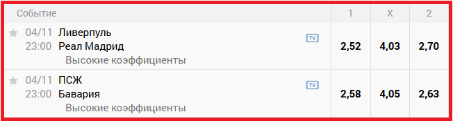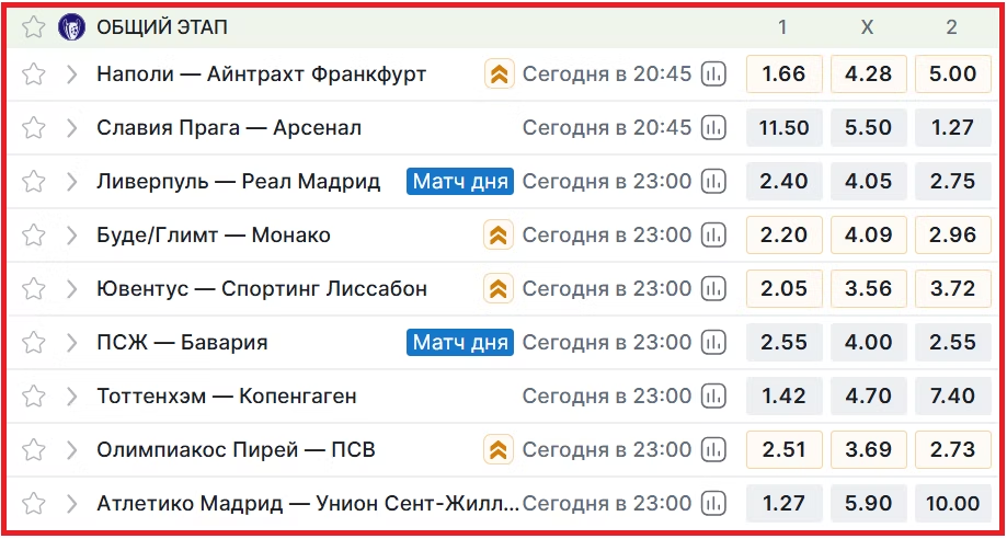 Из девяти матчей дня в Лиге чемпионов Fonbet предлагает воспользоваться новой фичей с повышенными котировками сразу в четырёх, однако ни «Ливерпуля» с «Реалом», ни «ПСЖ» с «Баварией» в этом списке нет. И даже лондонскому «Арсеналу» с мадридским «Атлетико» в их играх ничего не перепало — маржу урезали у совсем других встреч: