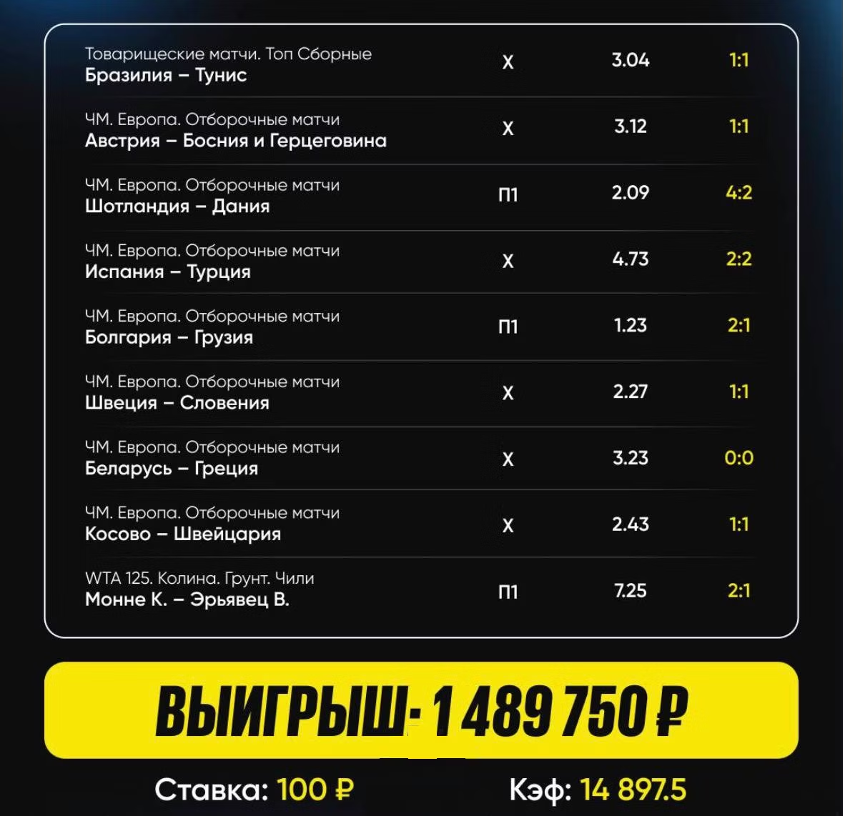 В этот весьма специфичный лайв-купон вошли восемь футбольных матчей — семь игр европейского отбора к ЧМ и товарка Бразилии с Тунисом: в шести из восьми автор экспресса зарядил на ничью — лишь во встречах Шотландия – Дания и Болгария – Грузия поверил в чистые победы хозяев. Однако главным блюдом стал вовсе не футбол, а теннисный матч WTA 125 в Чили между Кароль Монне и Вероникой Эрьявец, в котором этот гений зарядил на П1 с кэфом аж 7.25. Итоговый коэффициент составил почти 15 000, а сумма ставки — всего 100 рублей: поставить больше на такое безумие реально жалко.