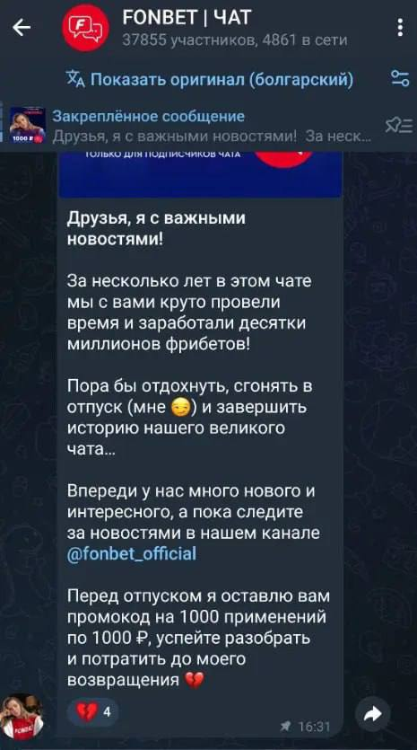 К вчерашнему вечеру в чате букмекера было почти 38 тысяч пользователей: каждый день Fonbet проводил там конкурсы с фрибетами, где нужно было угадывать исходы матчей, а игроки просто общались и топили за ставки друг друга 24/7. Но вчера произошло что-то странное: один из администраторов просто написал, что пришло время «сгонять в отпуск и завершить историю великого чата» — и после этого сообщения чат реально был удалён. На прощание админ оставил промокод на 1000 рублей фрибетом на 1000 активаций.