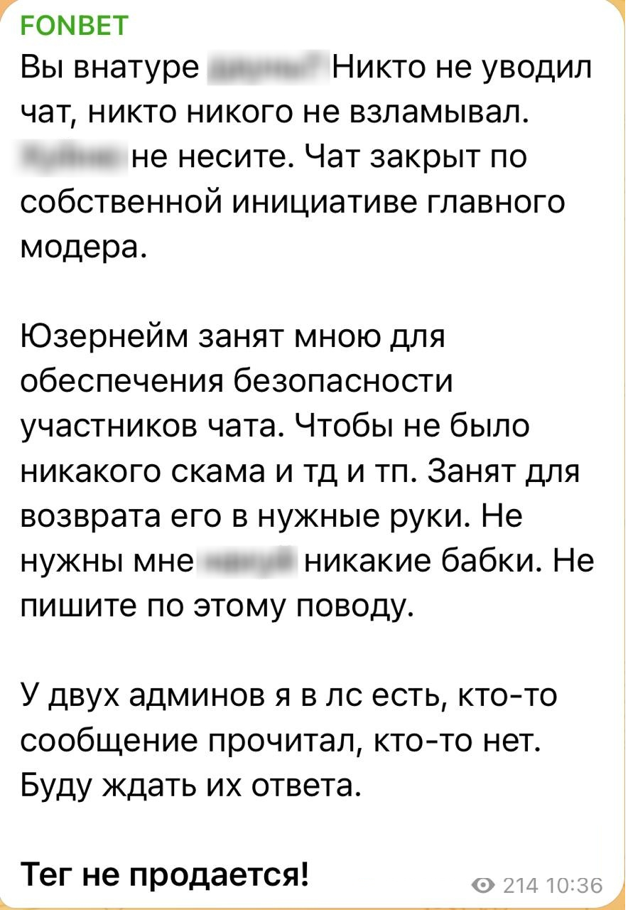 Что всё это было — до конца непонятно: одна из версий — взлом, хотя вот модератор киберспортивного чатика Fonbet утверждает, что основной чат просто ждут некоторые изменения. Если действительно так — способ внести эти изменения выбран довольно оригинальный.