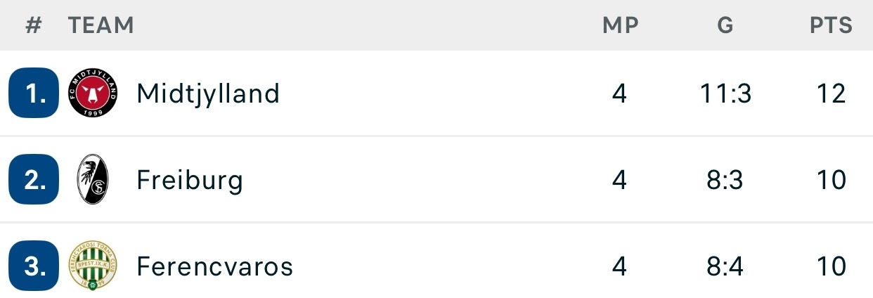 El único club con 12/12 en la fase de grupos es el danés Midtjylland (de hecho, todo el top‑3 resulta sorprendente). Han marcado 11 goles (el resto como máximo 9) y encajado solo 3. En tres de los cuatro partidos partieron como favoritos. En el otro, eliminaron a Nottingham a domicilio con cuota 9.50. Curioso: según Transfermarkt, su plantilla ni siquiera está entre las 20 más caras de la competición.