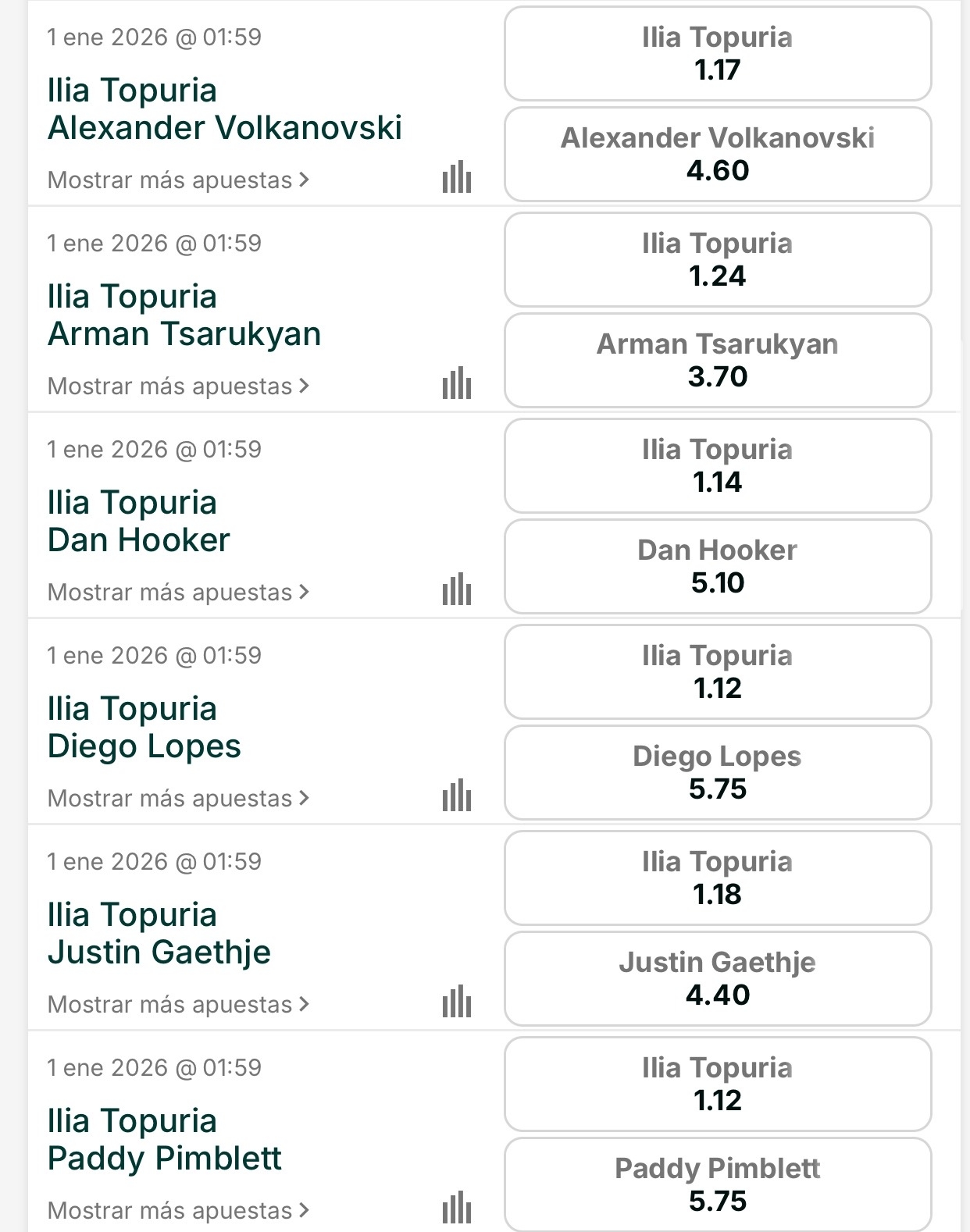 Остальных возможных соперников он вообще должен размазать по октагону, судя по кэфам: выше 1.20 только с Царукяном, которого Илия игнорит.