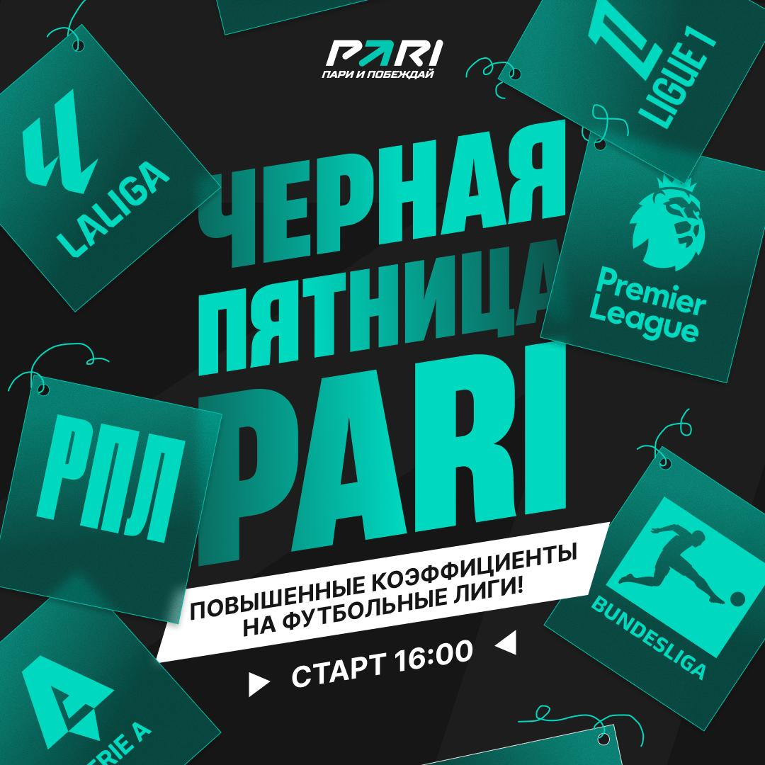 Пост об этом появился в телеграм-канале букмекера. Сообщается, что сегодня ровно на час с 16:00 до 17:00 МСК в PARI можно будет поставить с повышенными коэффициентами на матчи шести топовых футбольных лиг: АПЛ, Серии А, Бундеслиги, Лиги 1, Ла Лиги и РПЛ. Повод для акции очевиден — разумеется, «Чёрная пятница».