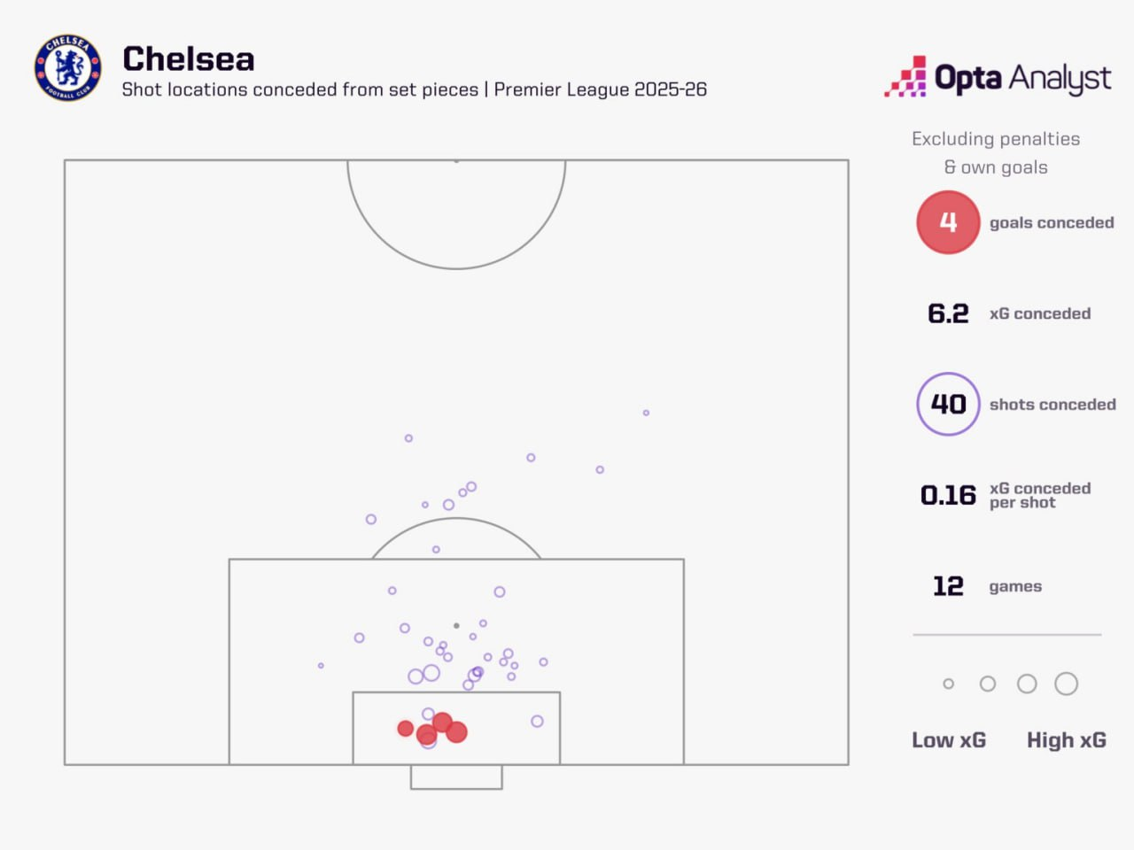 Сегодня «Арсенал» протестирует «Челси», который допускает уж слишком много остроты как раз со стандартов. Да, синие пропустили всего на один мяч больше (4), чем «Арсенал» (3), но продвинутые метрики показывают, что могло быть ещё как минимум два. Всего они допустили 6,2 ожидаемых гола — предпоследние цифры в АПЛ, хуже только «Бёрнли» (6,8) из зоны вылета. Более того, на стандарты приходится 43,5% от суммы допущенных xG — самая большая доля в Англии.