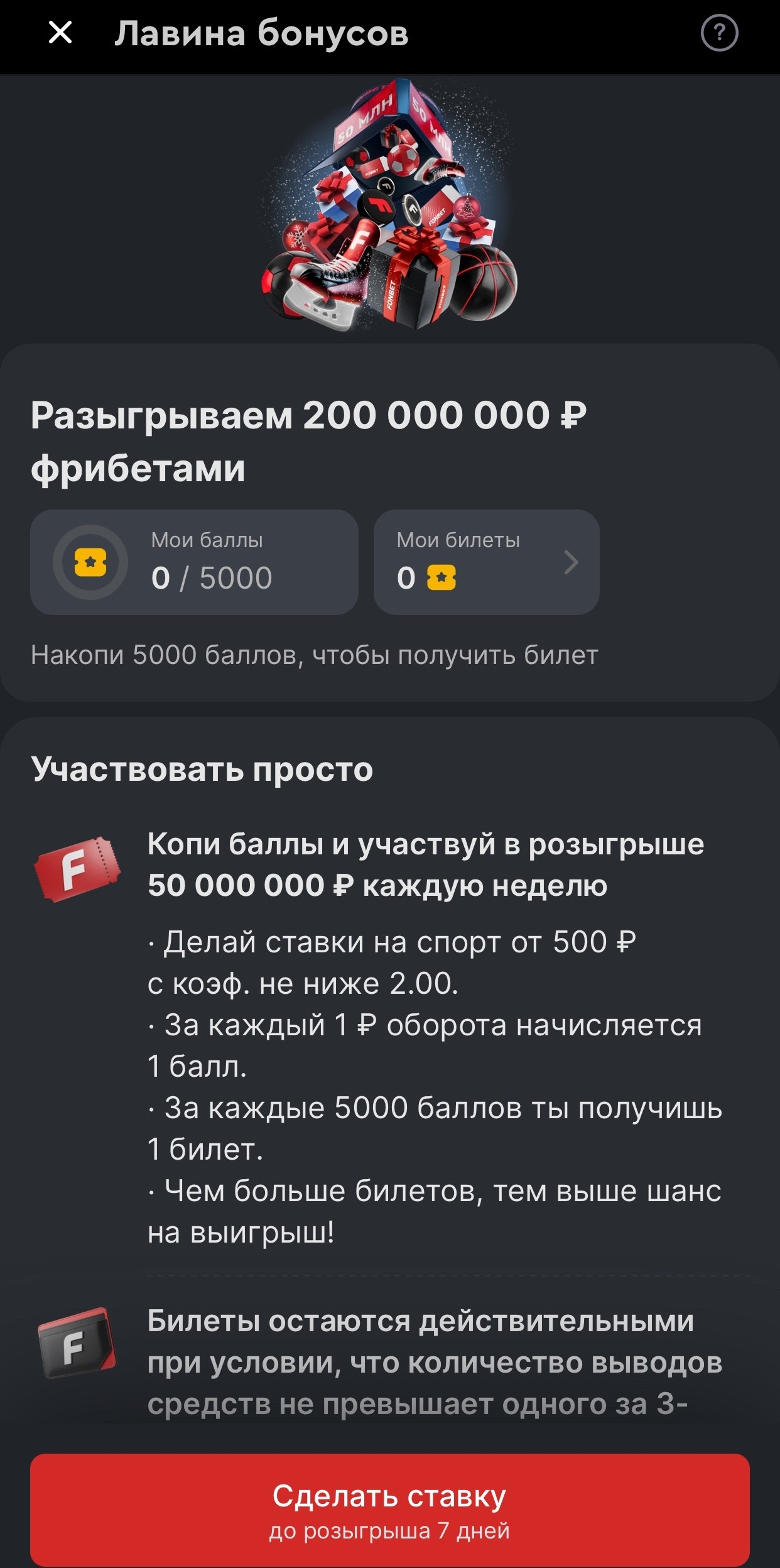 1️⃣ Для участия нужно копить билеты. Один билет — это 5 тысяч баллов, а один балл — один проставленный рубль.