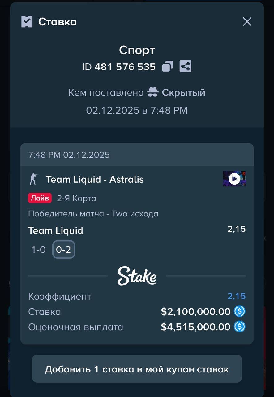 Перед стартом матча второй стадии Starladder Budapest Major 2025 кто-то мощно поверил в «ликвидов». Настолько, что зарядил на их победу аж 2,1 миллиона долларов с кэфом 2.15.