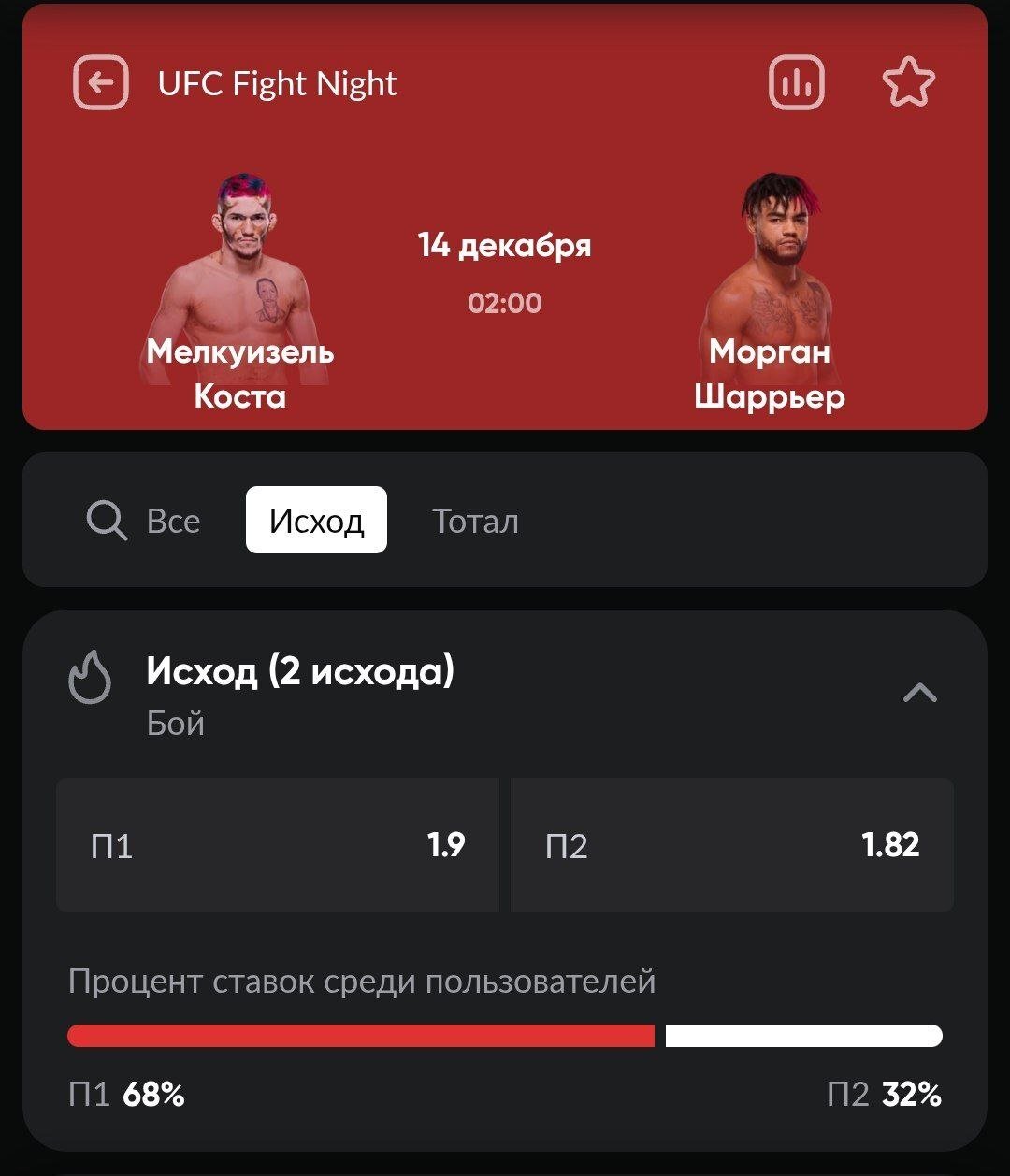 Соперник — Мелкизаэл Коста (24–7), и это тоже тревожный сигнал для француза: из 12 боёв, дошедших до судей, 9 Коста выиграл — нужно закрывать раньше. Букмекеры, кстати, котируют их практически по равной, но пользователи Betboom видят крепким фаворитом бразильца.
