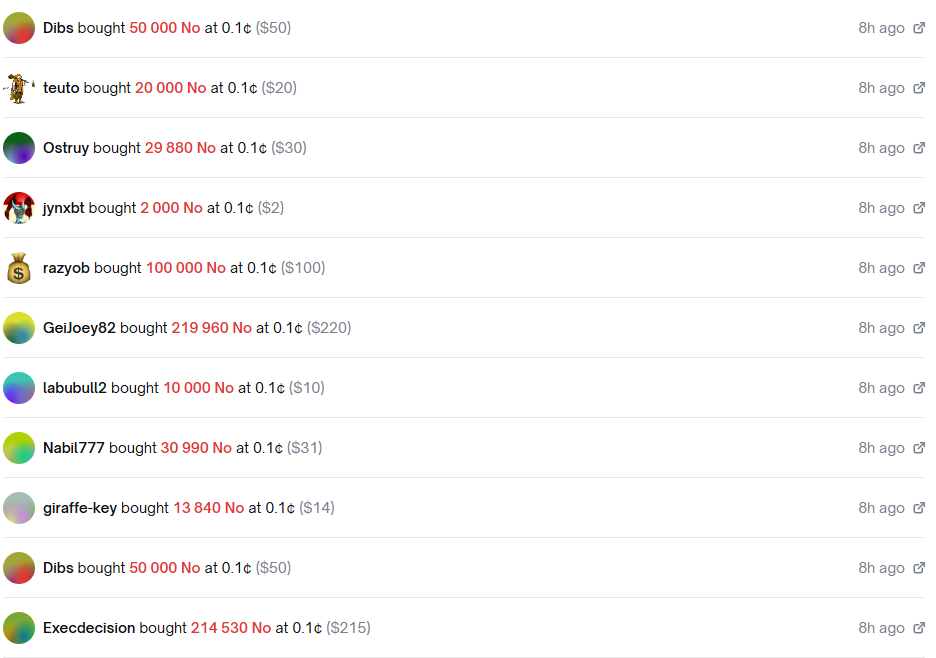 А ставивших на «Нет», очевидно, было немало: в последние минуты перед тем, как Polymarket всё рассчитал, многие отчаянно заряжали на очевидный валуй под коэффициент 1000 — однако практически сразу же потеряли деньги.
