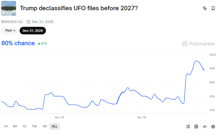 В последние несколько дней кто-то из пользователей Polymarket начал яростно прогружать связанные с этим рынки: к утру воскресенья на бирже вероятность того, что президент США раскроет файлы об инопланетной жизни до конца 2026-го, составляла лишь 30%, однако ко вторнику выросла уже до 92%. К этой минуте, правда, немного упала — до 80%: