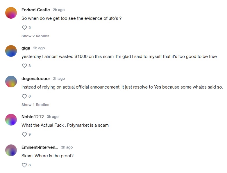 Пользователи, грузившие на «Нет», негодуют в комментариях, требуя справедливости и перерасчёта, и не понимают, почему биржа досрочно рассчитала ставки без каких-либо официальных объявлений от Трампа (что как бы предполагает само название рынка).