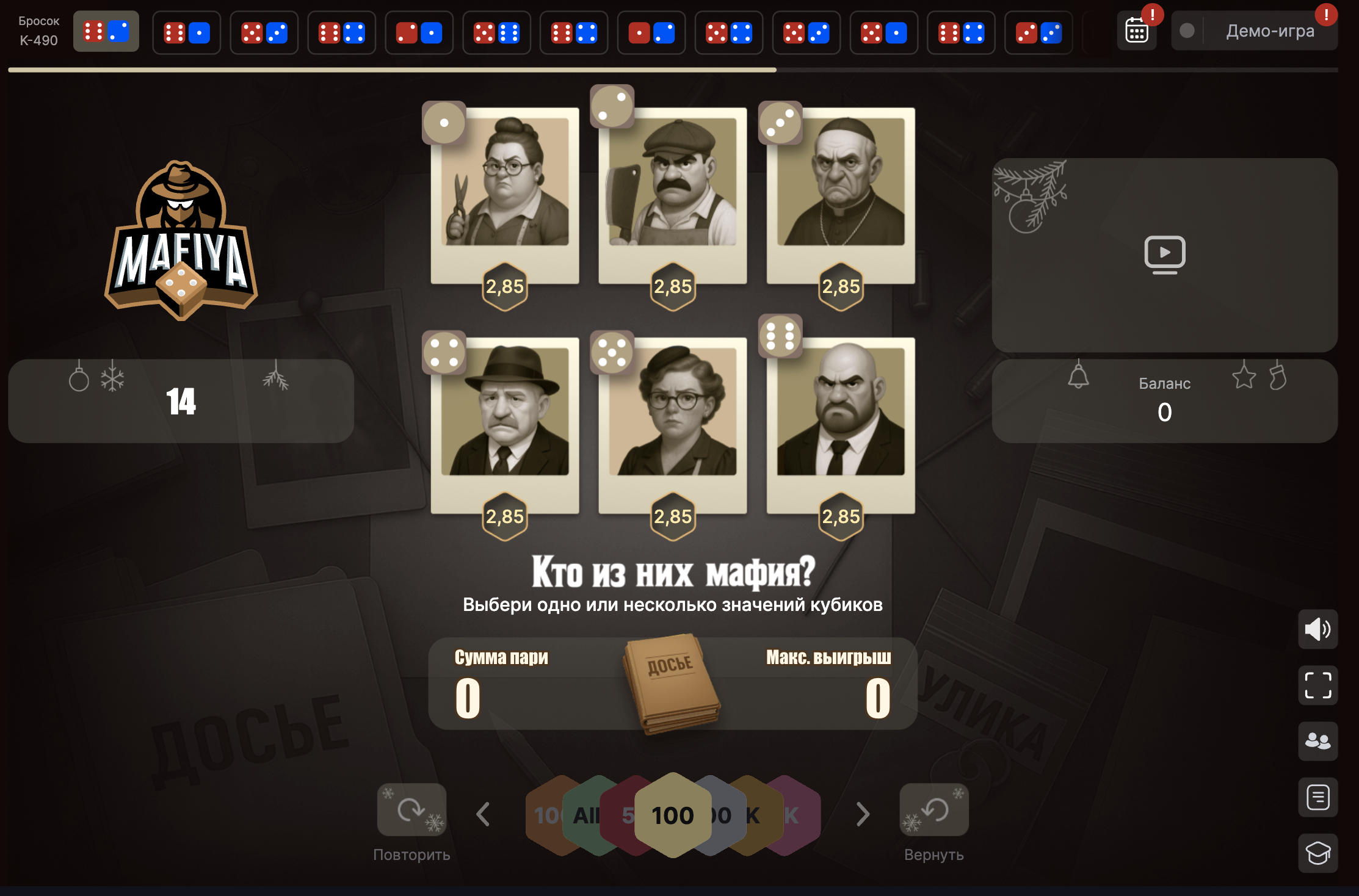 Правила простые: на доске шесть костей (их цвет никак не влияет на результат), а задача — угадать, какое именно значение покажет кубик на баффл-боксе. Для этого нужно разместить номинал на значениях, которые, по вашему мнению, и могут выпасть. При желании можно зарядить и на все кости сразу — шанс угадать повышается, но сумма выигрыша будет существенно ниже. За победу с дублями можно получить карточку «Донов» мафии. Те, кто соберут все досье, раскроют «Крёстного отца» и получат бонус.