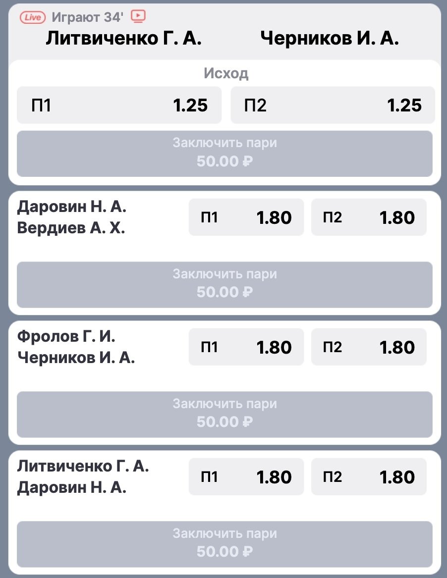 Помимо угадывания выброшенных костей, можно ставить на победу одного из игроков. Правда, к марже много вопросов: в лайве на маркете П1/П2 она достигает 36,5%, в прематче — 10%.