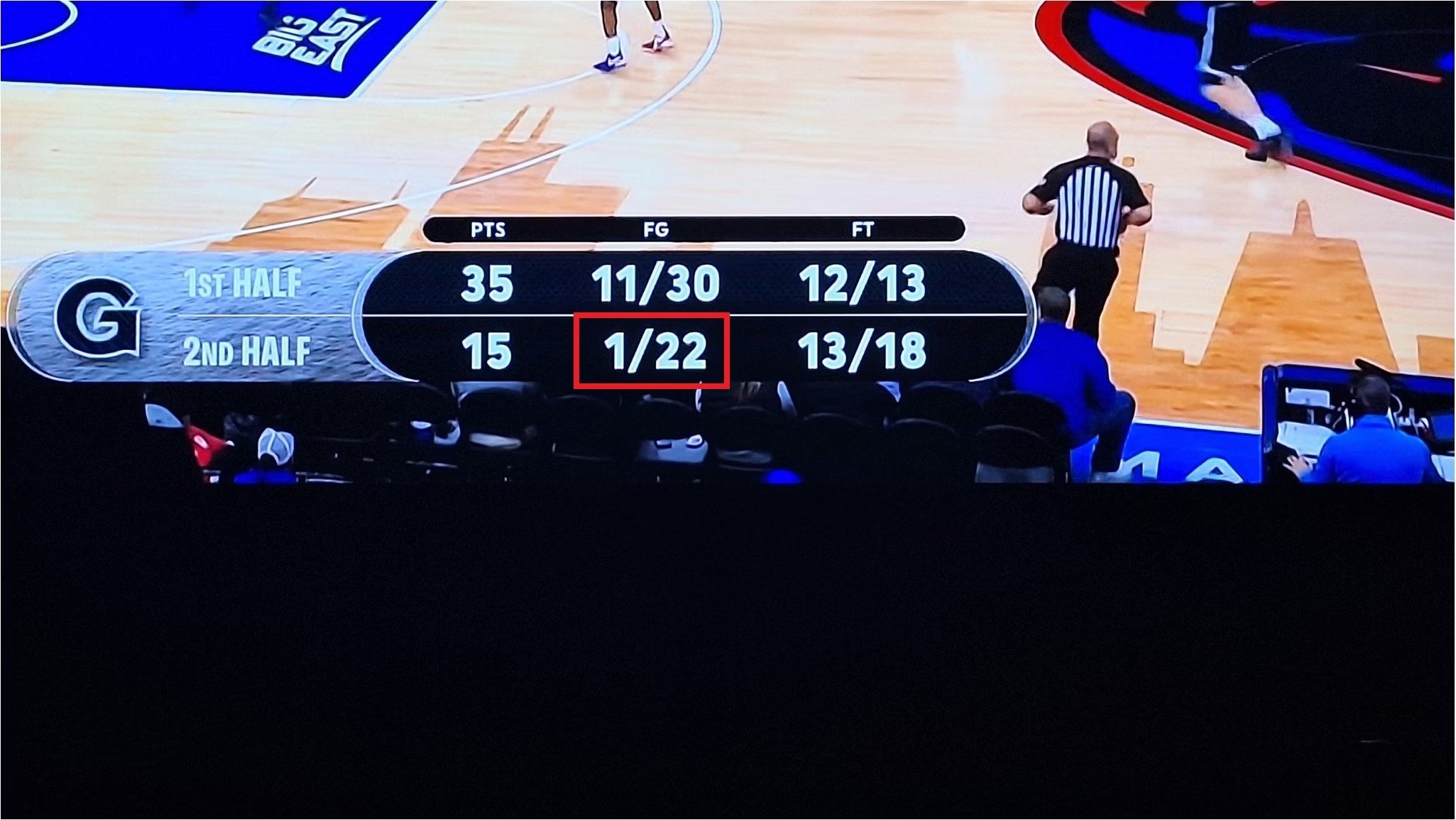 После перерыва «Джорджтаун» забил 1/23 бросков с игры (скрин выше сделан примерно за минуту до конца)! Более того, это попадание, случившееся за 10:07 до окончания второй половины, стало для гостей единственным аж за последние 23 минуты матча. Игру «Джорджтауна» во второй половине встречи в американских соцсетях уже назвали «одним из худших атакующих перформансов в истории спорта».