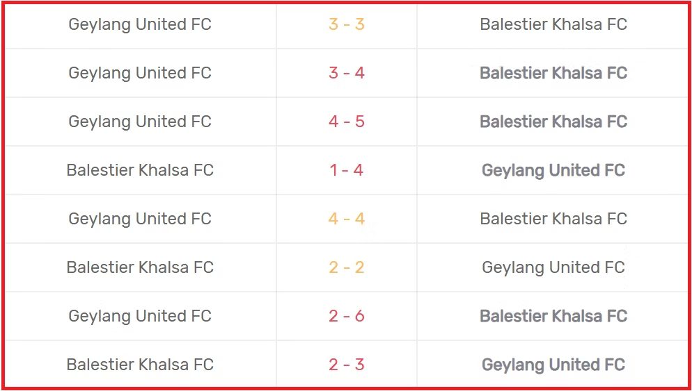 52 goles en solo 8 partidos, una media de 6,5 por encuentro. El Más de 3,5 goles se dio en los ocho partidos, mientras que el Más de 4,5 se cumplió en siete de ellos. Además, al menos un gol se ha marcado en 23 partes consecutivas de los partidos entre Geylang International y Balestier Khalsa.