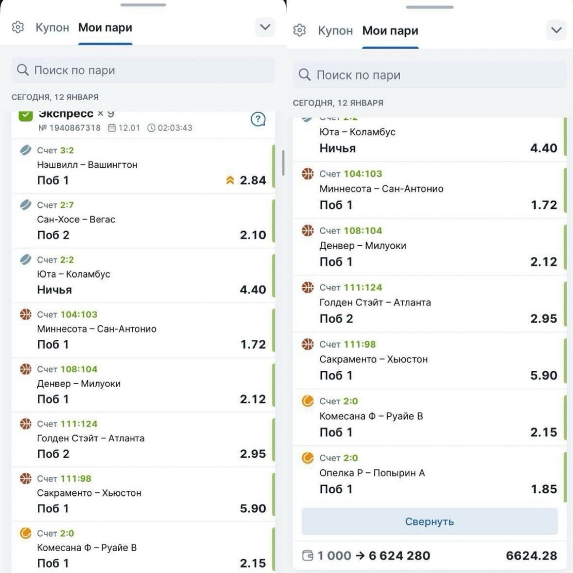 Заехал кэф 6624.28, причём накрутил его автор всего за девять событий. И ставка не самая маленькая — не каждый грузанёт на такое сразу 1000 рублей. В этот раз риск был полностью оправдан, а на баланс упали 6,6 млн. Причём ехал экспресс несколько дней, так как «Юта» с «Коламбусом» играли в ночь на 12 января. Завезли третий овертайм в личках подряд, кстати.