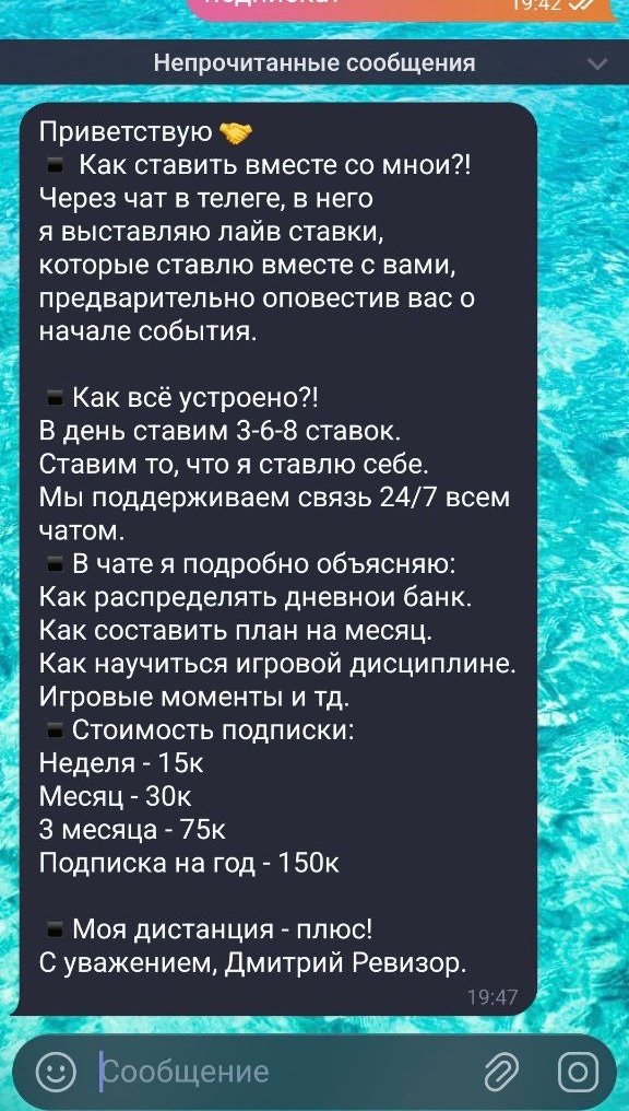 Ну а дальше скамеры как бы от лица каппера продают платные подписки на неделю, месяц или даже год — «по скидке же, надо брать!». Само собой, как только клиент отправляет деньги, тут же улетает в блок или попадает в игнор.