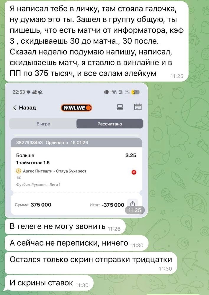 «Он [фейк-админ] представился мной, сказал, что у него есть договорняк и попросил за него 60 тысяч — 30 сразу и 30 после захода. Подписчик заплатил, получил сигнал на ТБ 1,5 в первом тайме матча ''Арджеш'' — ''Стяуа'', поставил 375К рублей по коэффициенту 3.25 и, конечно же, проиграл. Дальше — по классике: звонки в Телеграме отключены, переписка удалена».