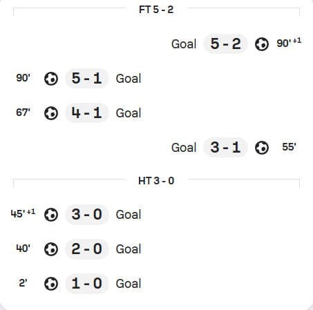 К перерыву счёт стал 3:0, к 67-й — 4:1. Дальше — классический сценарий: тишина до самой концовки, а на 90-й минуте пробился нужный тотал; ну а на 91-й ещё один мяч прилетел, ну так, чтобы наверняка. Итог — 5:2.