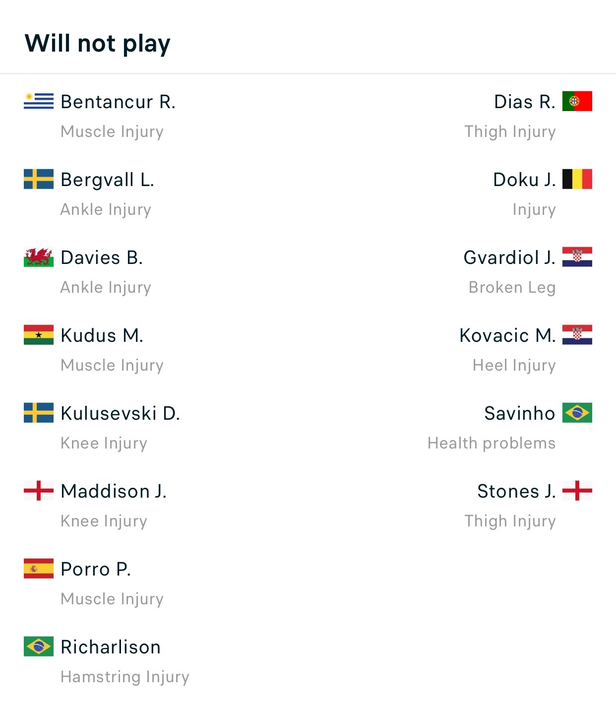В матче с «Сити» команде не помогут сразу восемь человек: Ришарлисон, Порро, Мэддисон, Кулушевски, Кудус, Дэвис, Бергваль и Бентанкур. Вылетели сразу четыре полузащитника, три игрока атаки и основной правый защитник.