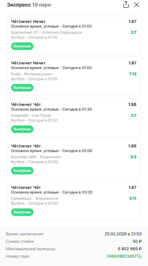 И ведь мужчина не запаривался, просто собрал ночной паровоз из разных лиг с единственным условием — чтобы к утру все они завершились. Логики в выборе исходов не было никакой: 18 из 19 событий — это ставки на чёт/нечёт по угловым, то есть абсолютный рандом.