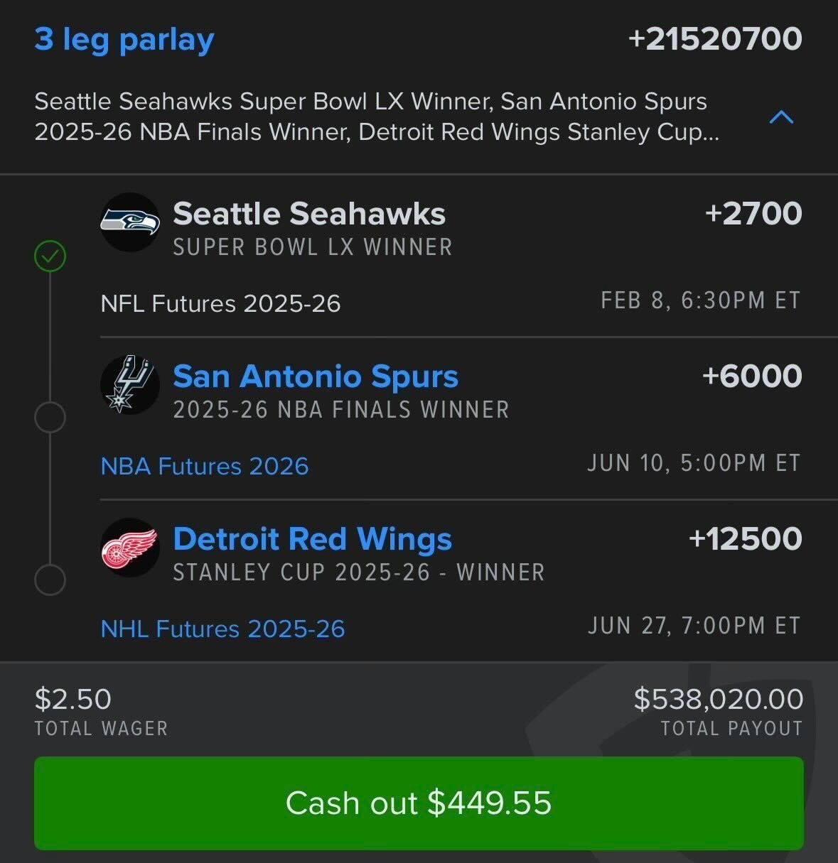 И нет, это не бесконечный паровоз из десятков рандомных событий. Всё довольно ёмко и лаконично. Пресс состоит из трёх долгосроков, но очень дорогостоящих — победитель Супербоула, финала НБА и Кубка Стэнли. Воткнул он туда всего 2,5 доллара, потенциальный выхлоп — $538 020.