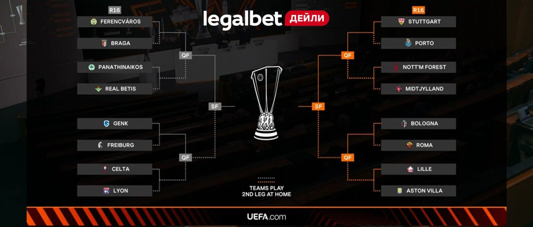 3.70 «Панатинаикос» — «Бетис» (1.27) (2.45) «Болонья» — «Рома» (1.55)(3.30) «Генк» — «Фрайбург» (1.34)(2.85) «Лилль» — «Астон Вилла» (1.43)(1.49) «Ноттингем» — «Мидтьюлланд» (2.65)(2.10) «Сельта» — «Лион» (1.73)(3.80) «Ференцварош» — «Брага» (1.27) (2.10) «Штутгарт» — «Порту» 1.74