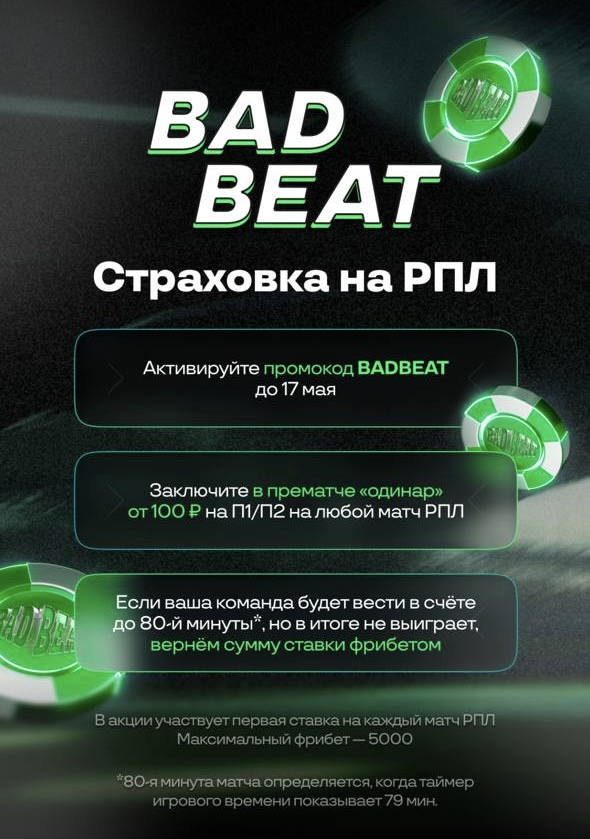 «Лига Ставок» перед рестартом чемпионата России запустила такую же. В чём суть: если ваша команда будет вести к 80-й минуте и в итоге не выиграет, сумма ставки вернётся на баланс фрибетом, но не более 5000 рублей. Букмекер уточняет: 80-я минута — это когда на табло горит 79:ХХ.