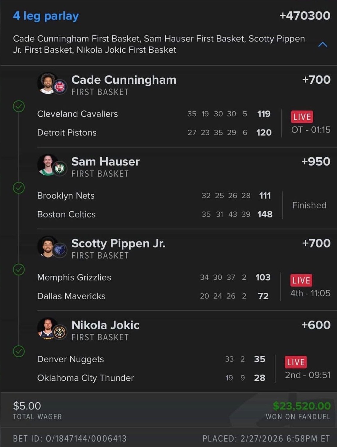 После трёх заходов у игрока была возможность выкупить ставку — Патрик влупил 5 долларов, но FanDuel предлагал залутать 2 200 и на этом успокоиться. Клиент пошёл до конца — дождался, пока на площадку выйдет Никола Йокич и завершит начатое. Правда, пришлось понервничать — первым бросочком серб промахнулся, мяч ушёл «Оклахоме», но и Лу Дорт не реализовал свою трёху. Джокер залутал подбор в защите, погнал под чужое кольцо и набрал два очка с фолом, открыв счёт за 7.00.