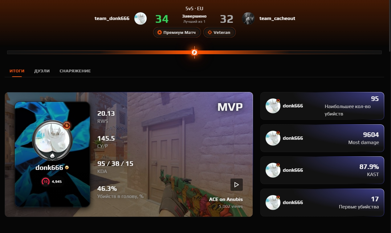 9604 урона всего и 145,5 в среднем за раунд, 17 опен-фрагов и всего 38 смертей за 66 сыгранных раундов — что-то дикое для любого игрока, кроме Донка, конечно.