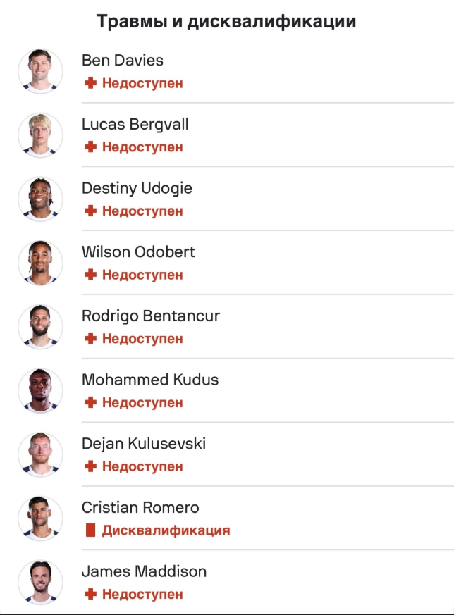 И с качеством состава до сих пор беда: из лазарета выползли Порро и Дансо, но точно не сыграют аж девять игроков. Хотя теперь у «Тоттенхэма» есть возможность провести замены, не выпуская кого-то из молодёжки.