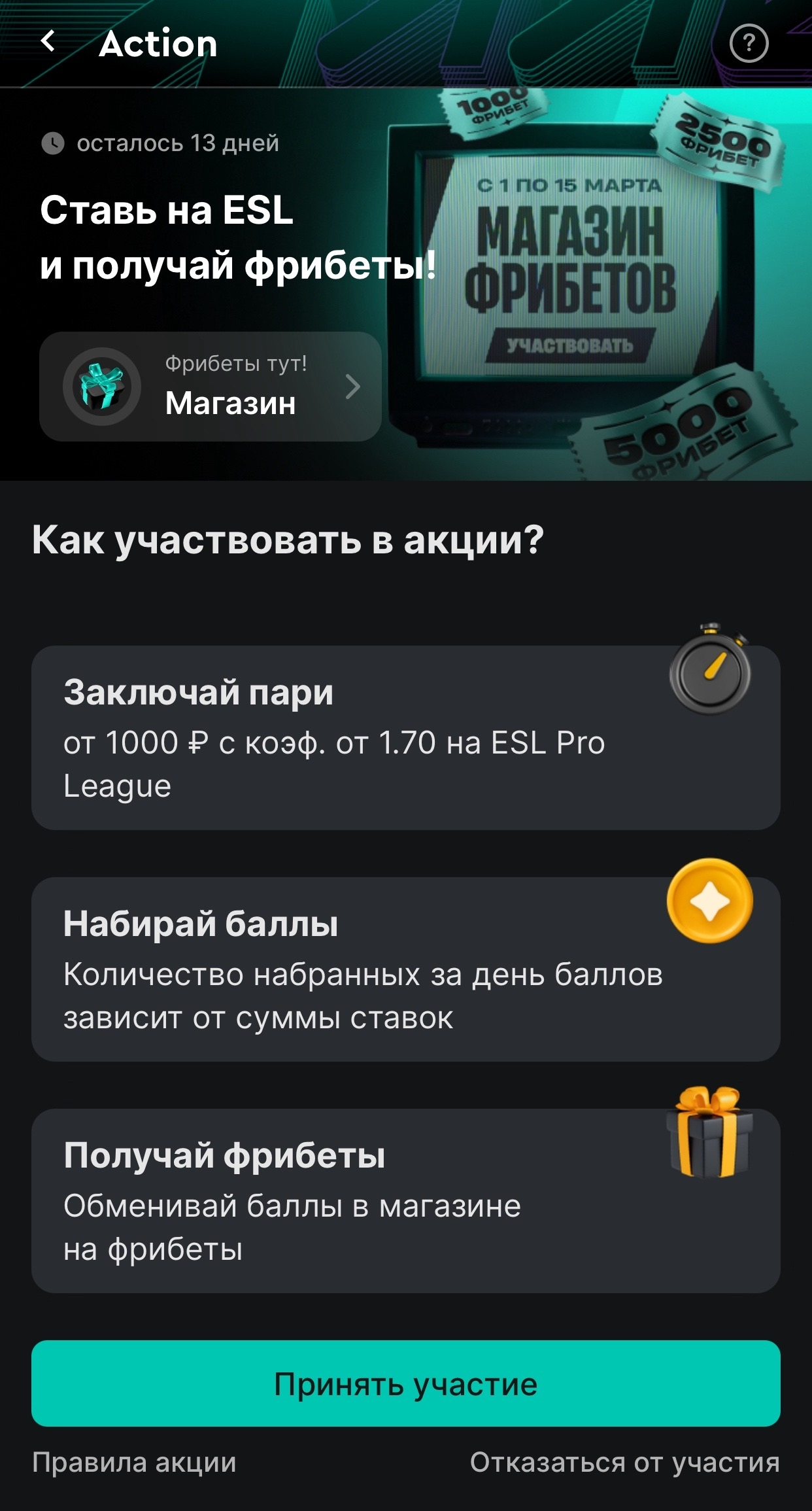 Получить их можно за ставки на ESL Pro League S23, но сначала надо найти в сторис или в специальном разделе «Магазин фрибетов» и подтвердить участие.