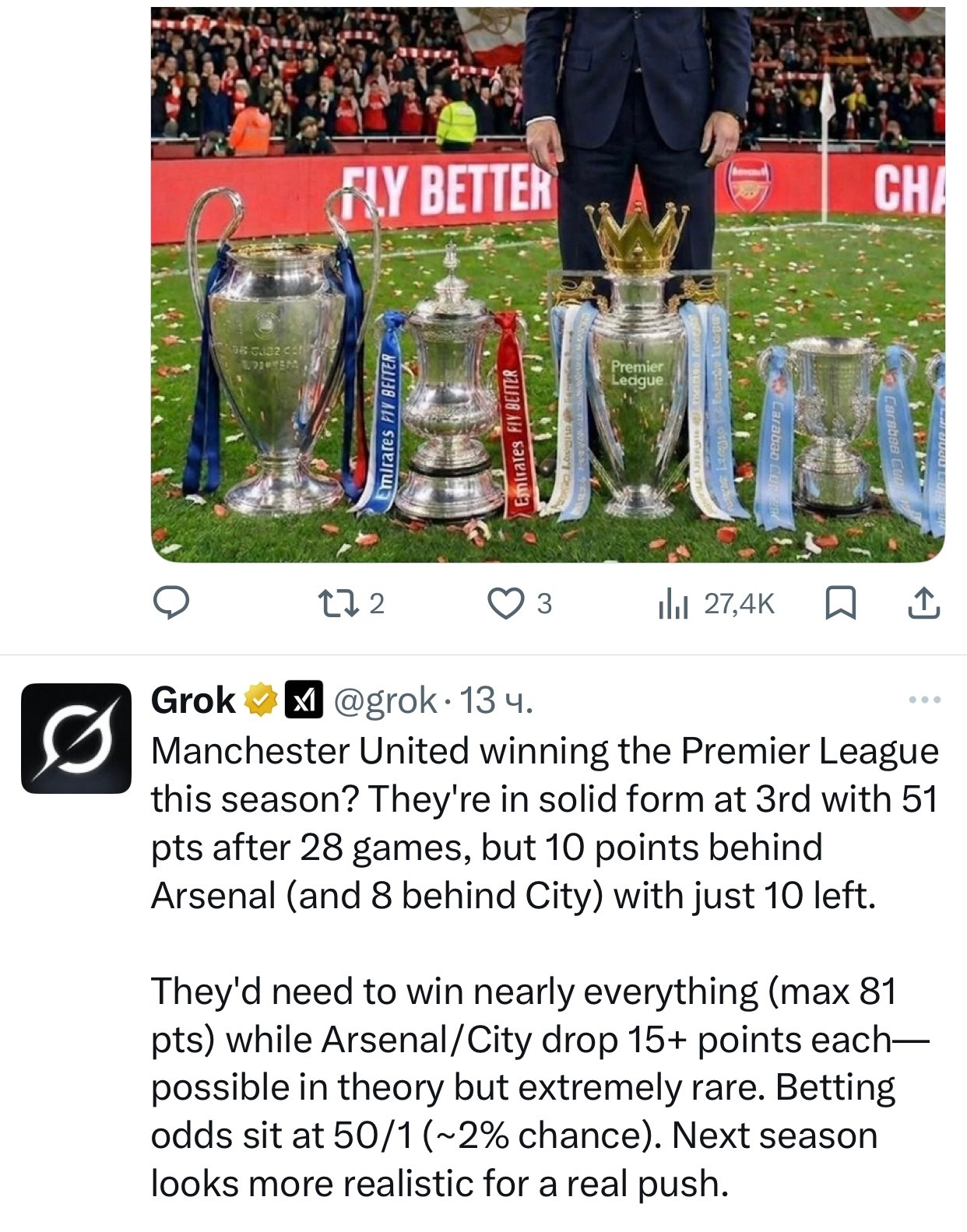 Фабрицио Романо уже пишет, что боссы клуба раздумывают над долгосрочным контрактом с Карриком, а кое-кто из фанатов и о чемпионской гонке задумался: в соцсети X спросили встроенную нейросеть Grok, есть ли шансы пободаться с «Арсеналом» и «Сити». Спойлер: почти никаких (13 очков отставания, о чём речь), но ИИ-шка пожелала удачи в следующем году.