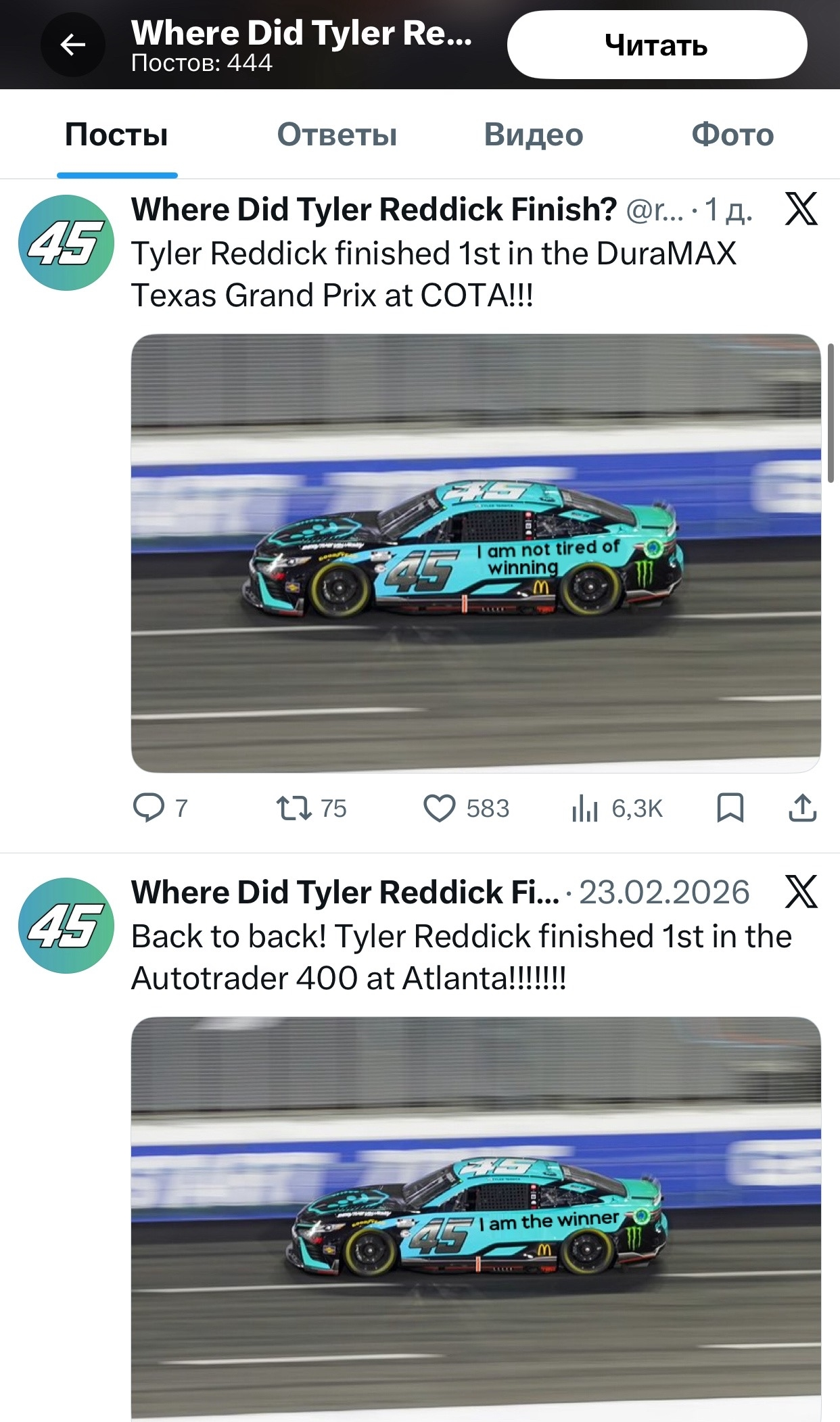 Итоги: впервые за 77 лет один пилот забрал все три первые гонки NASCAR Cup Series. И это Тайлер Реддик из 23XI Racing. Сначала мужчина выиграл Daytona 500, потом пришёл первым на EchoPark Speedway в Атланте, ну и закосплеил ачивку босса победой в Техасе 1 марта.