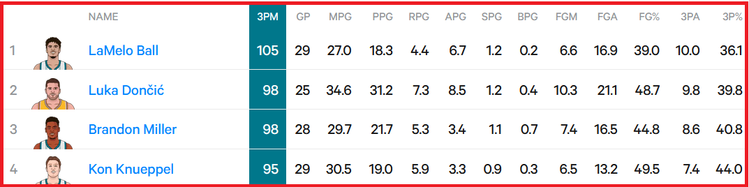 В топ-4 сразу три игрока стартовой пятёрки «Шарлотт»: Болл, Миллер и Книппел. Между ними ещё затесался некий Лука Дончич, возможно, вы слышали о таком. В общем, ничего удивительного, что «Хорнетс» забрали пять последних матчей по трёшкам с суммарной разницей (+49).