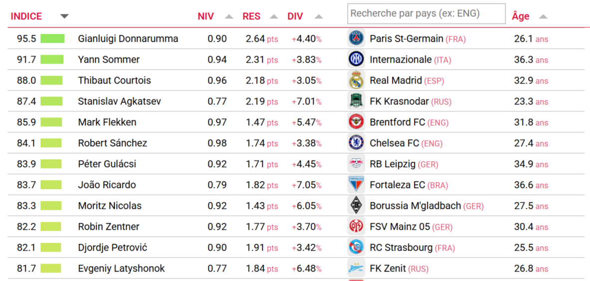 Топ-10 лучших вратарей мира за последний год по версии CIES (с указанием индекса):