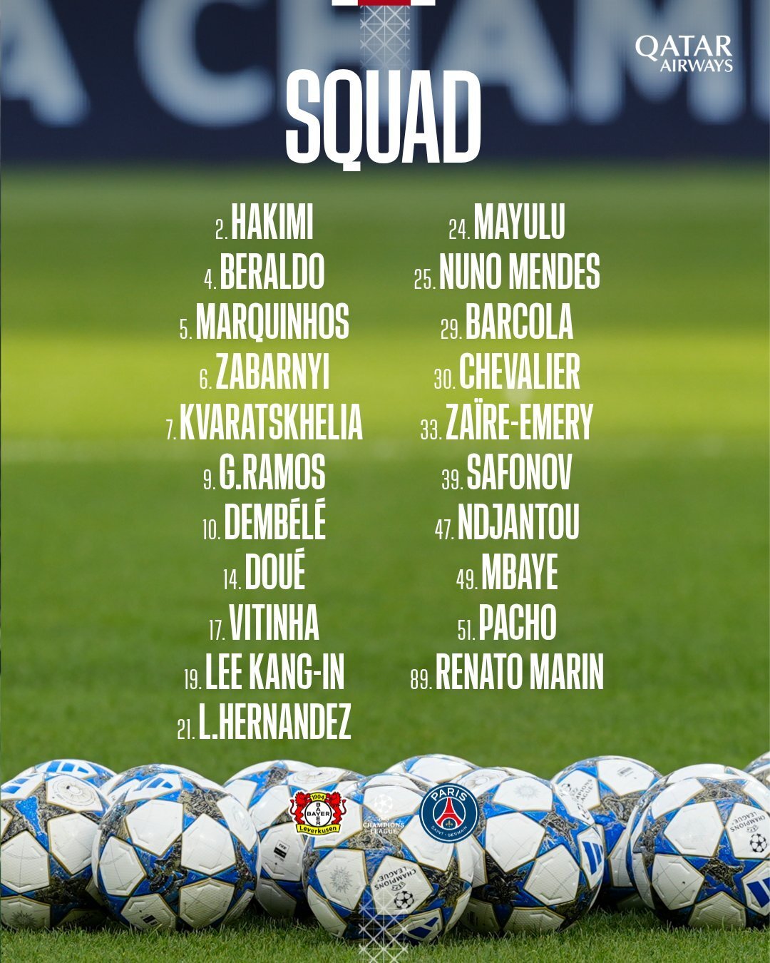 В состав французского клуба на игру с леверкузенцами также включены российский вратарь Матвей Сафонов, грузинский вингер Хвича Кварацхелия и украинский защитник Илья Забарный. Против «фармацевтов» не смогут сыграть полузащитники Фабиан Руис и Жоау Невеш, которые восстанавливаются после мышечных повреждений.