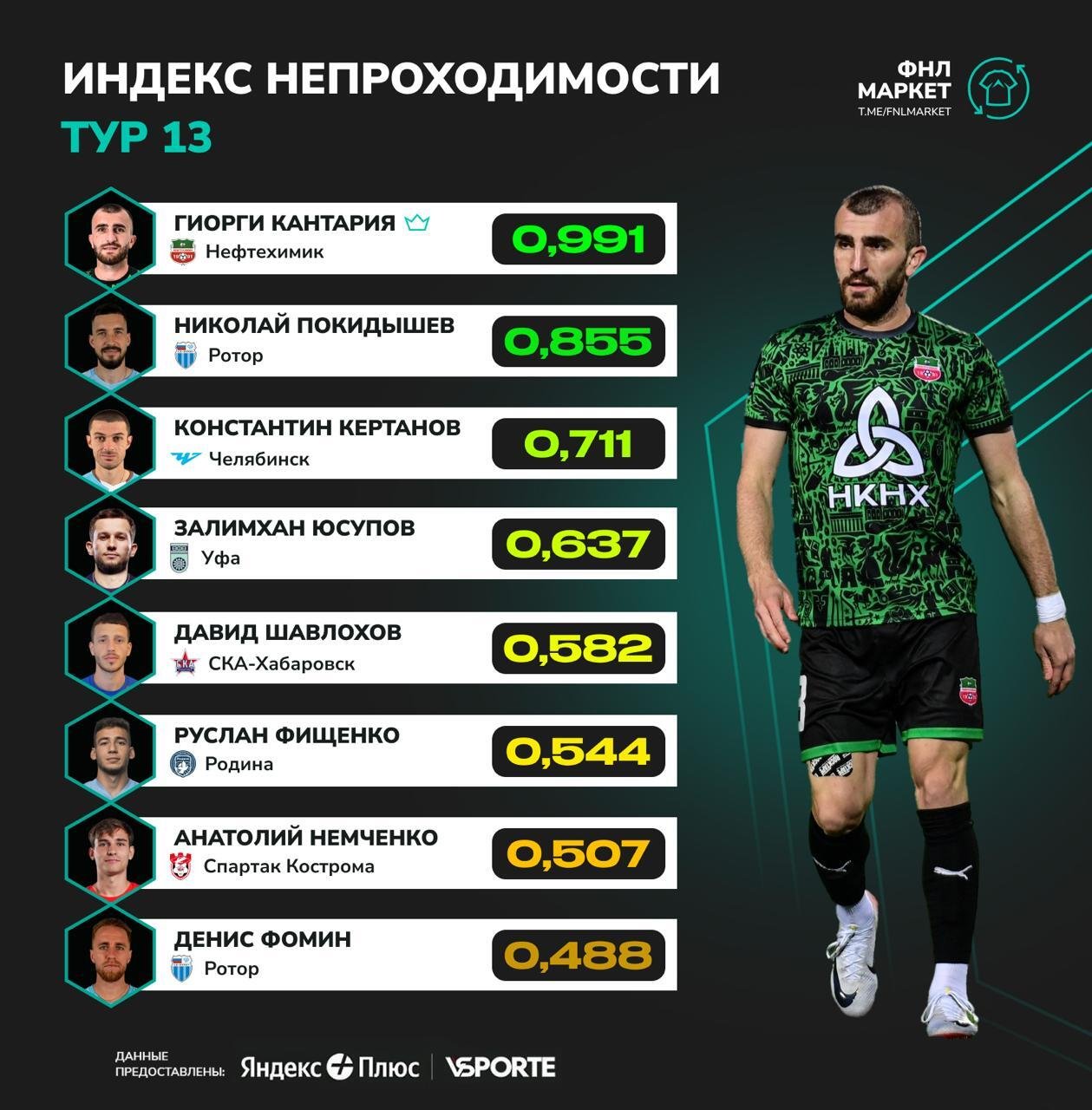 Футбольная национальная лига (ФНЛ) опубликовала рейтинг лучших игроков 13-го тура Лиги PARI по индексу непроходимости.