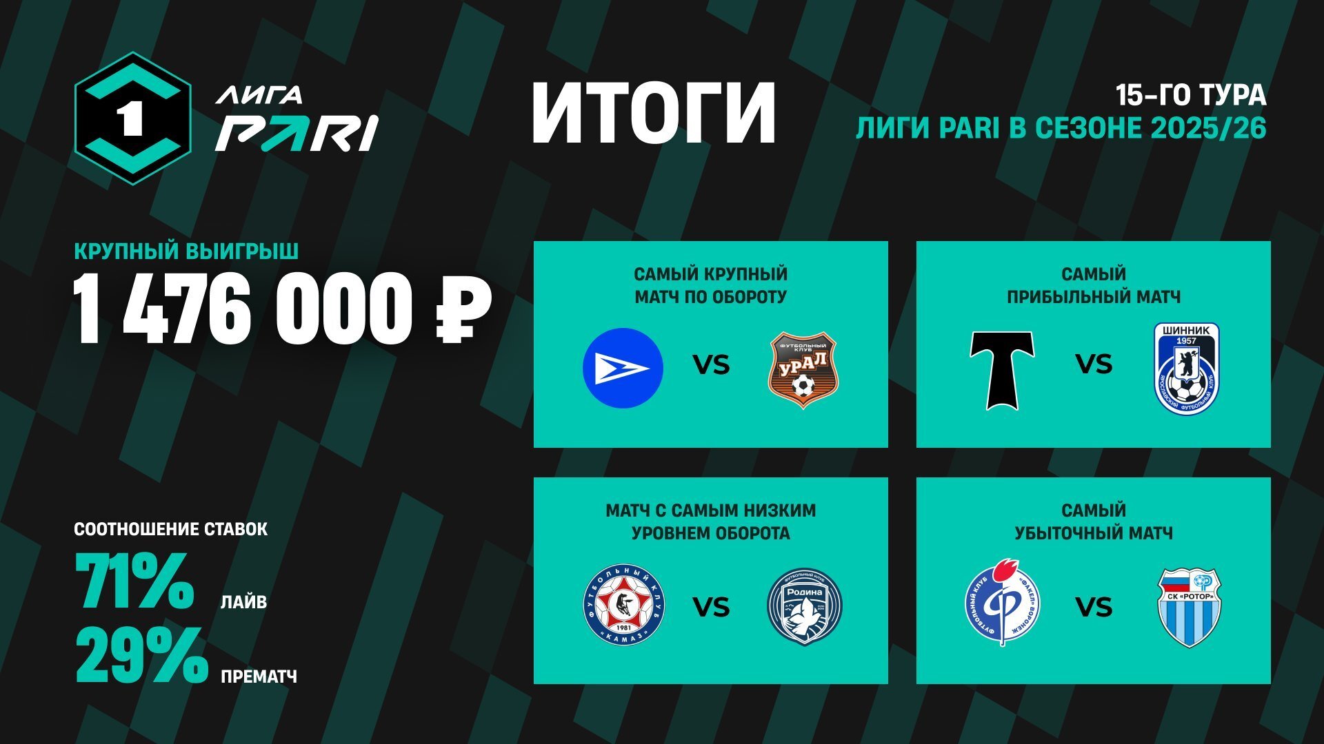 В 15-м туре Лиги PARI крупнейшим по объему принятых ставок стал матч «Чайка» — «Урал» (0:1), на который пришлось почти 16% от всего оборота пари на матчи тура. На втором месте игра «Челябинска» и «Арсенала» с долей в почти 13%. На третьем месте матч «Факел» — «Ротор» (12%).