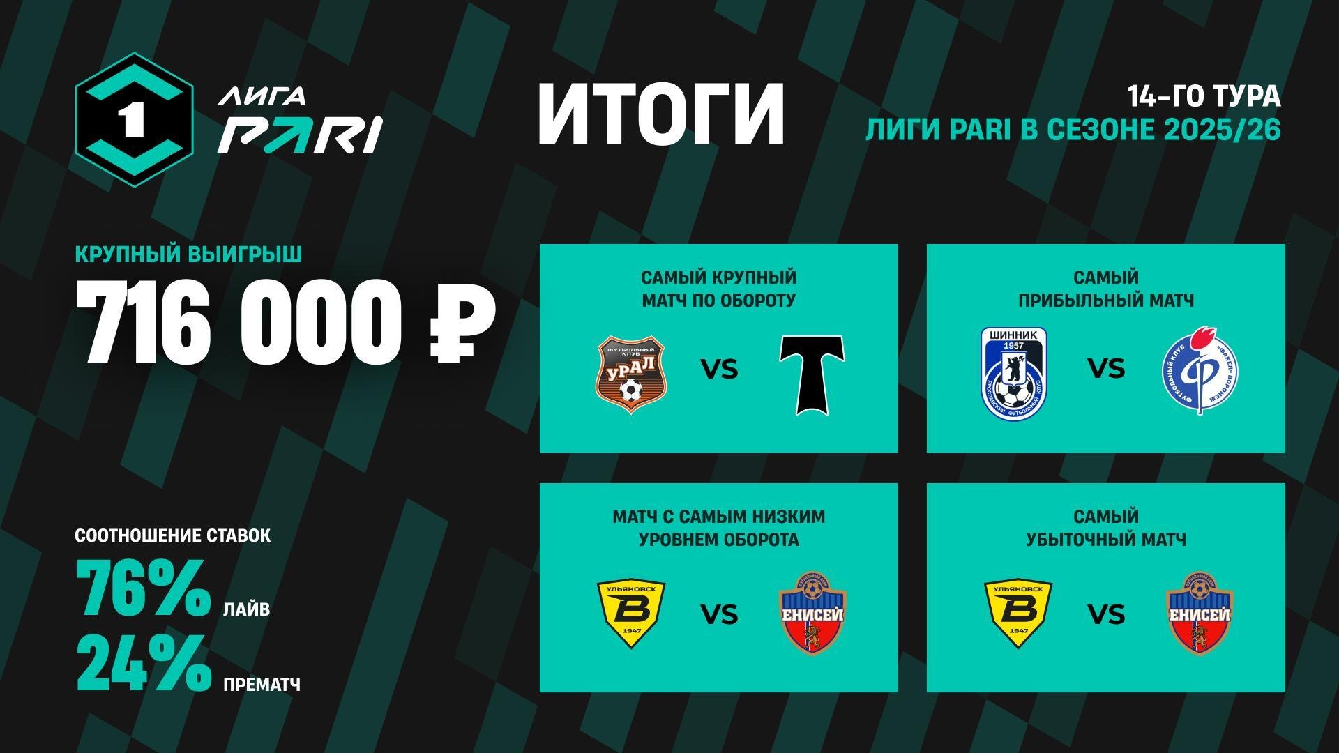 Для клиентов PARI в 14-м туре Лиги PARI самыми удачными матчами стали встречи «Арсенала» и «Торпедо», «Сокола» и «Уфы», а больше всего они выиграли на матче «Волги» и «Енисея».